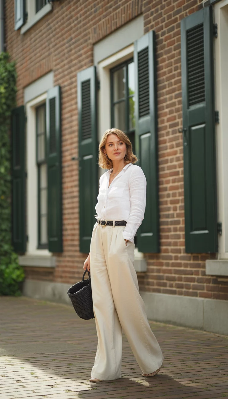 You can pair a crisp white linen shirt with flowing cream wide leg trousers to create an silhouette that screams expensive European vacation.