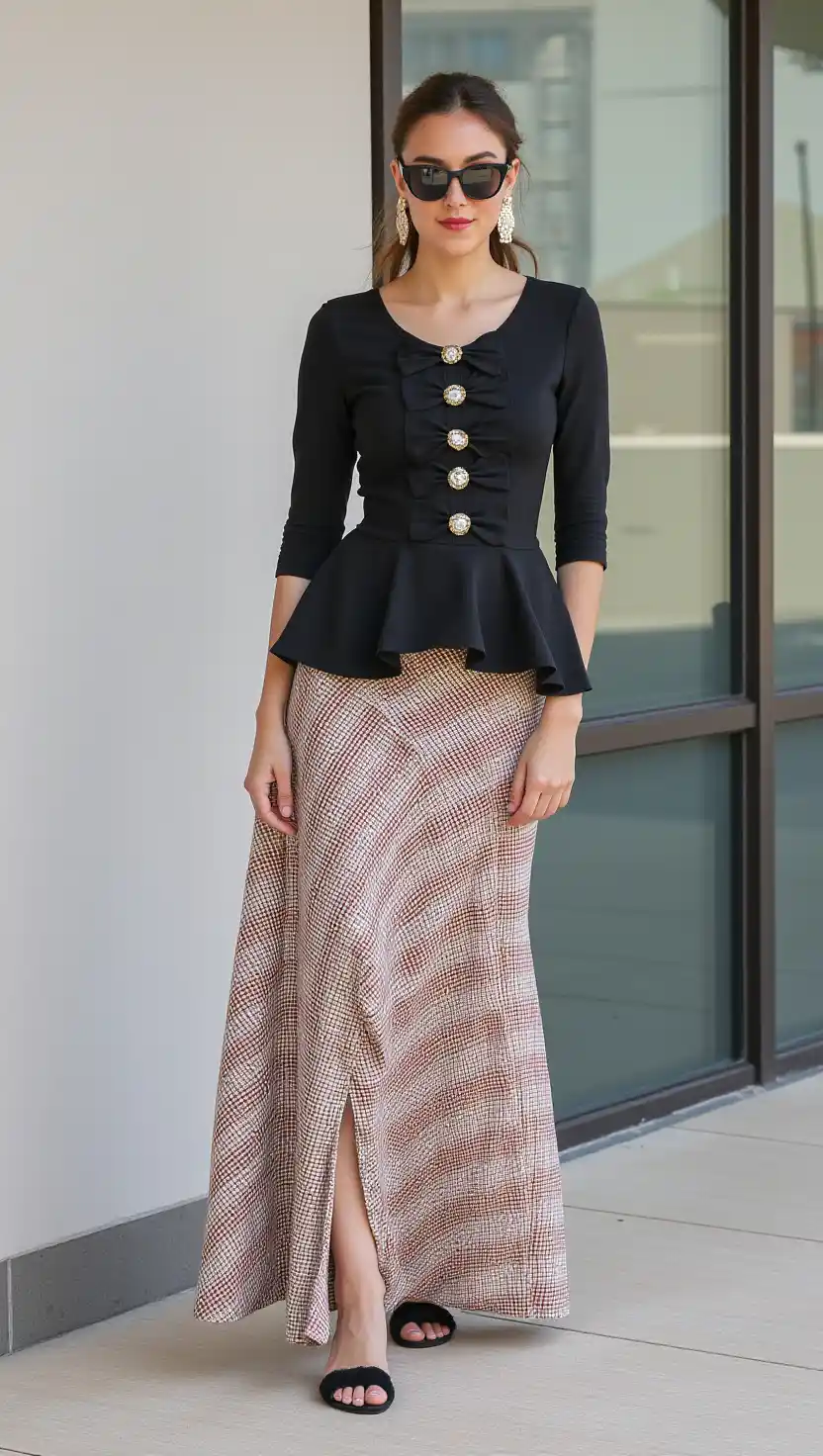 Paired with a stylish brown and white plaid maxi skirt, you are embracing autumnal patterns in a fresh way.
