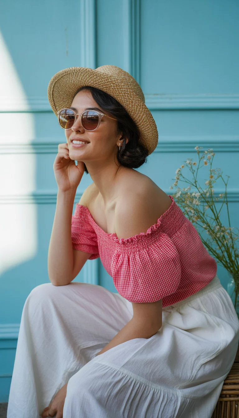 This outfit works perfectly for a backyard barbecue where you want to look effortless but secretly hope everyone notices your coordinated accessories and retro round sunglasses.