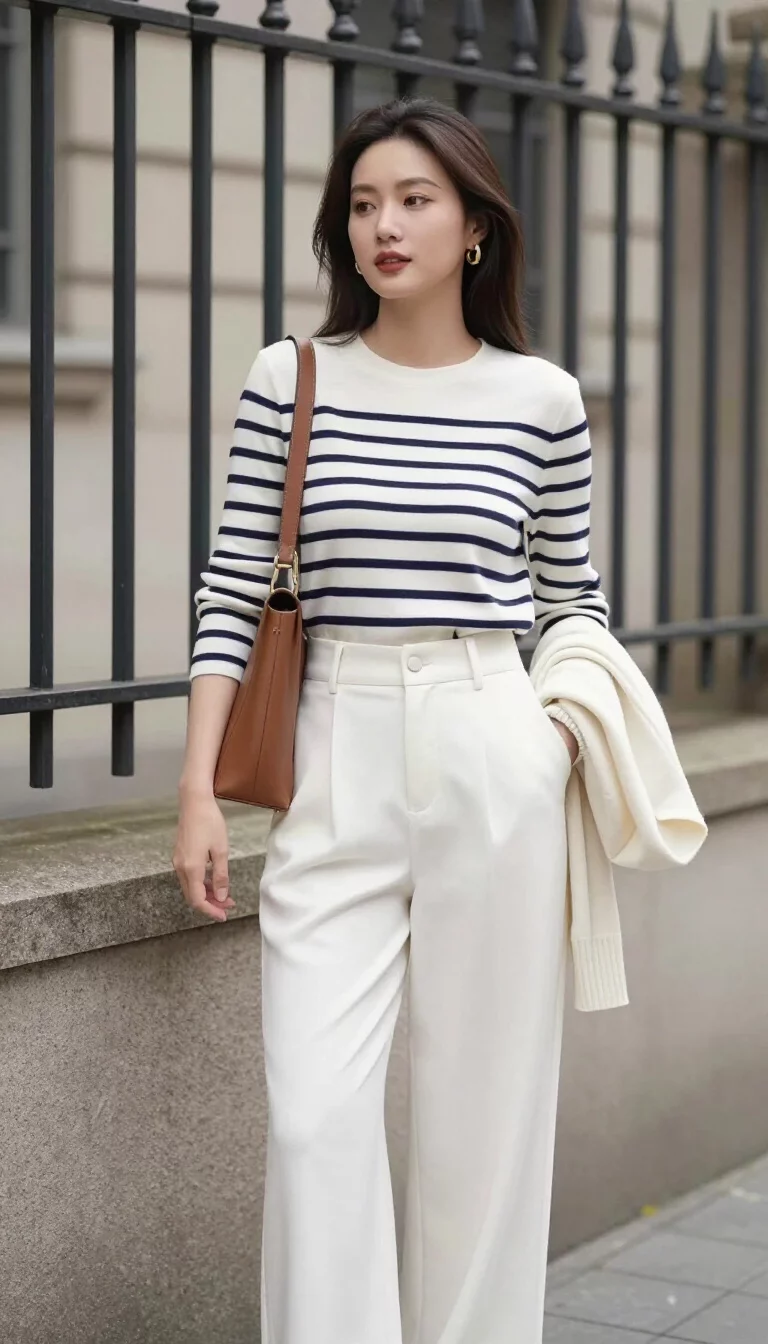 Draping a navy and white striped sweater over your shoulders provides that essential texture and color contrast.