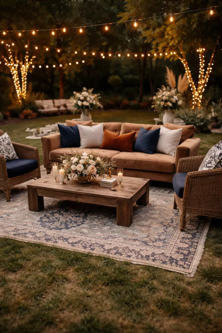 Mix textures like velvet and wicker to create a sophisticated vibe that feels like a living room moved outside.