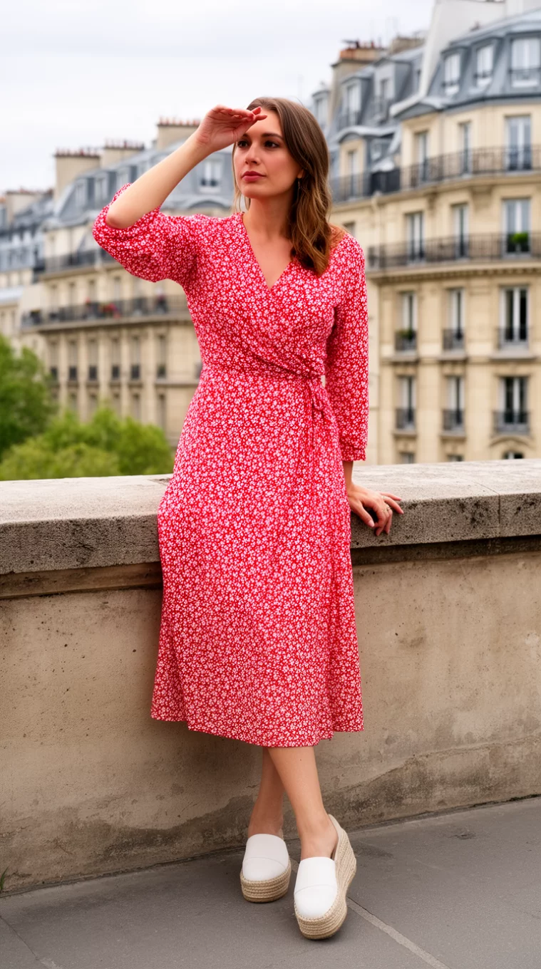 A red and white wrap dress offers a timeless silhouette that flatters every figure while reflecting the romantic spirit of the French capital.