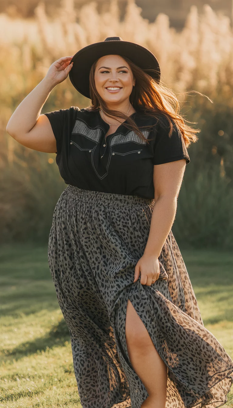 You can stick to your aesthetic by tucking a black band tee into a leopard print slit midi skirt.