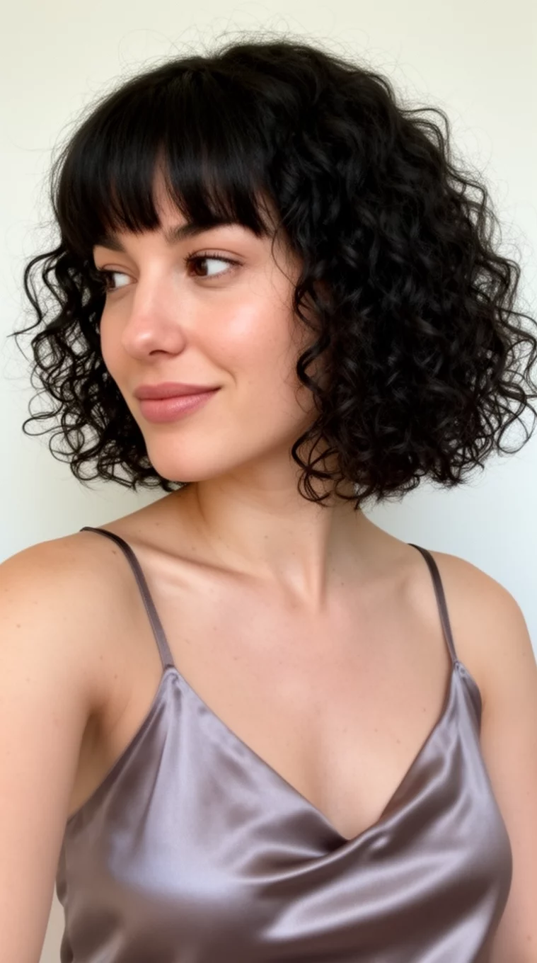 This look features dense, dark curls that hit right at the jawline.