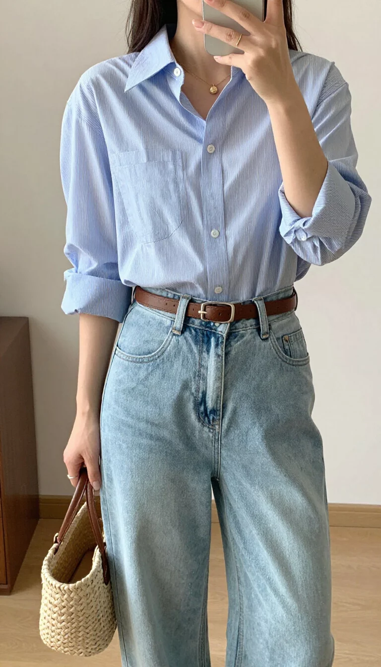 This ensemble relies on the classic appeal of a crisp button-down shirt tucked tightly into wide-leg denim.