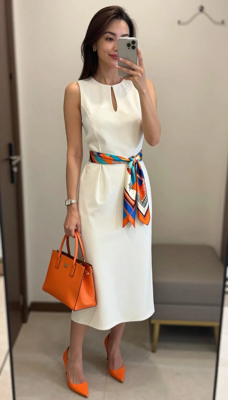 A white sleeveless midi dress serves as the ultimate blank canvas for your most ambitious accessories.