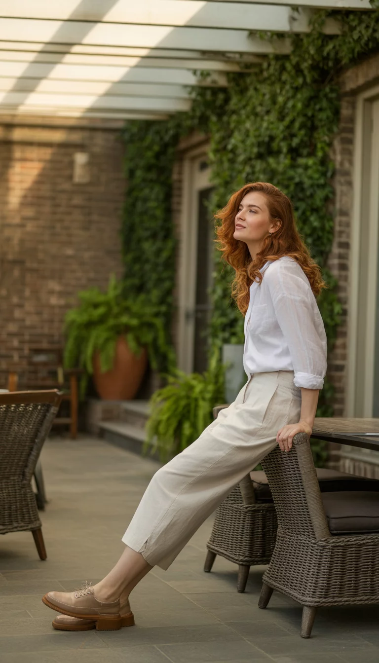 Cropped Light Beige Linen Pants And Brown Oxfords