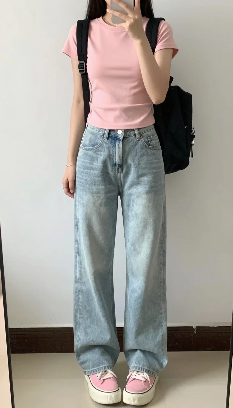 Light blue wide-leg jeans maintain that breezy aesthetic while covering enough skin for comfort in those surprisingly chilly lecture halls.