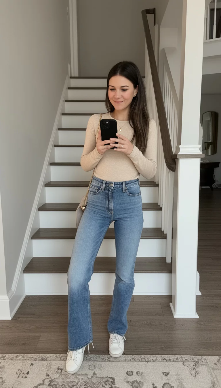 It sits perfectly against medium wash straight leg jeans, creating a clean line that works for running errands or meeting friends for coffee.