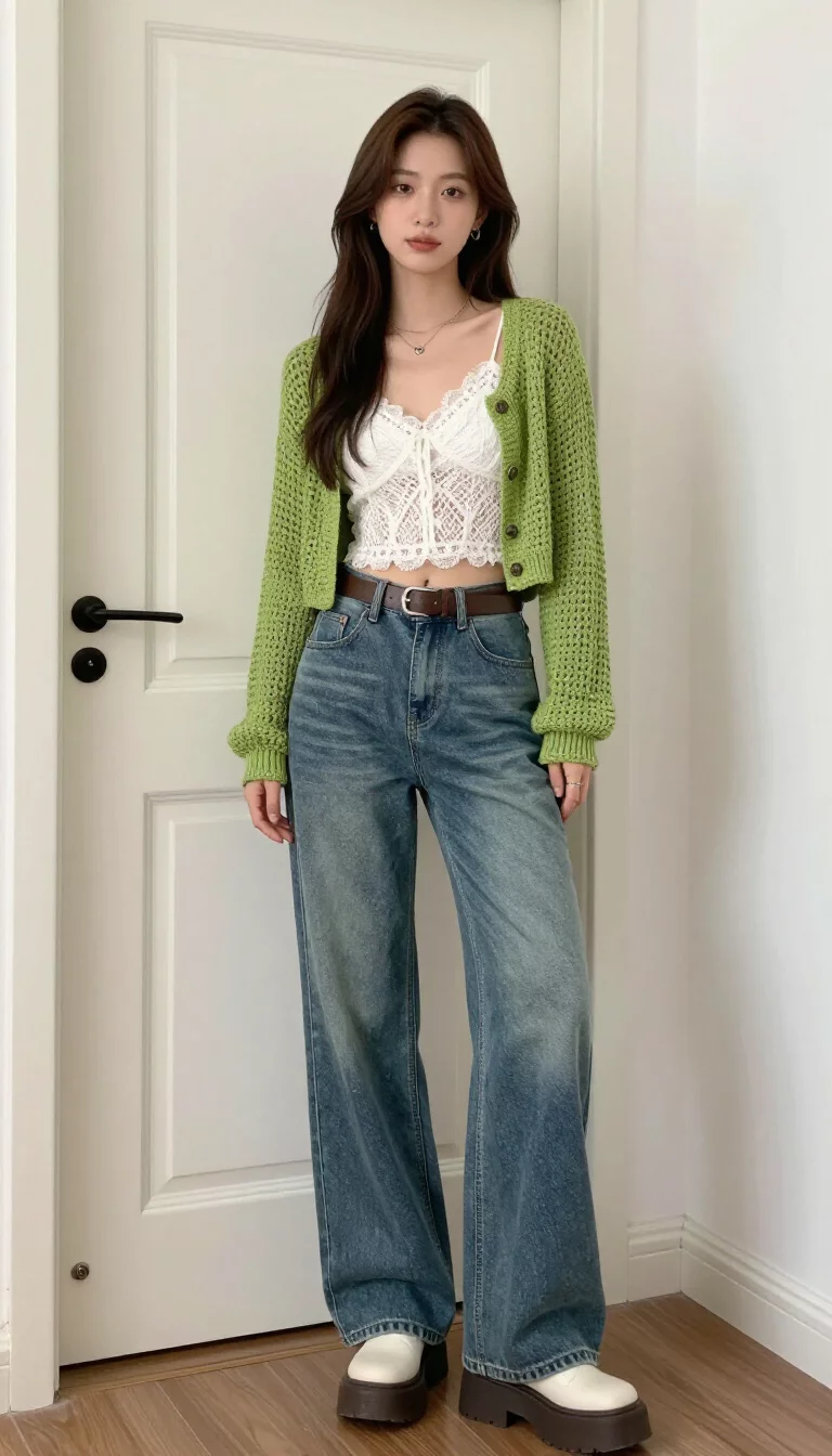 A light pink tank top layered under a white cropped cardigan offers a sweet, feminine touch.