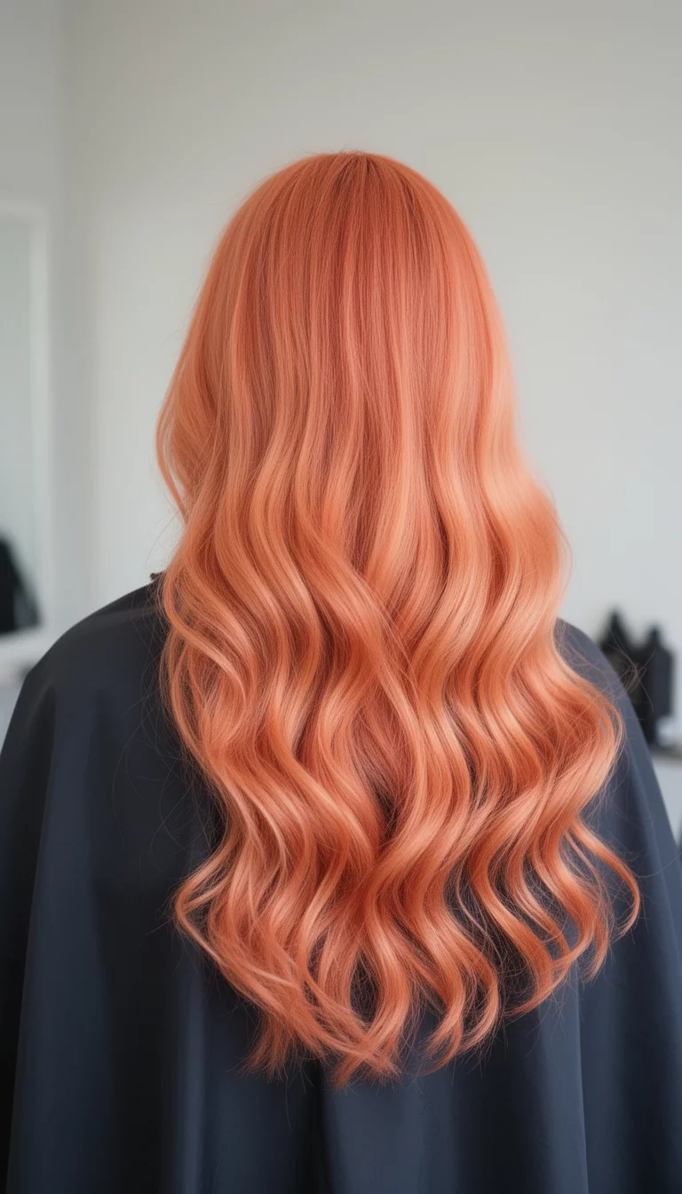Peachy nectarine blonde features long, wavy hair with a unique orange tint and contrasting dark roots.