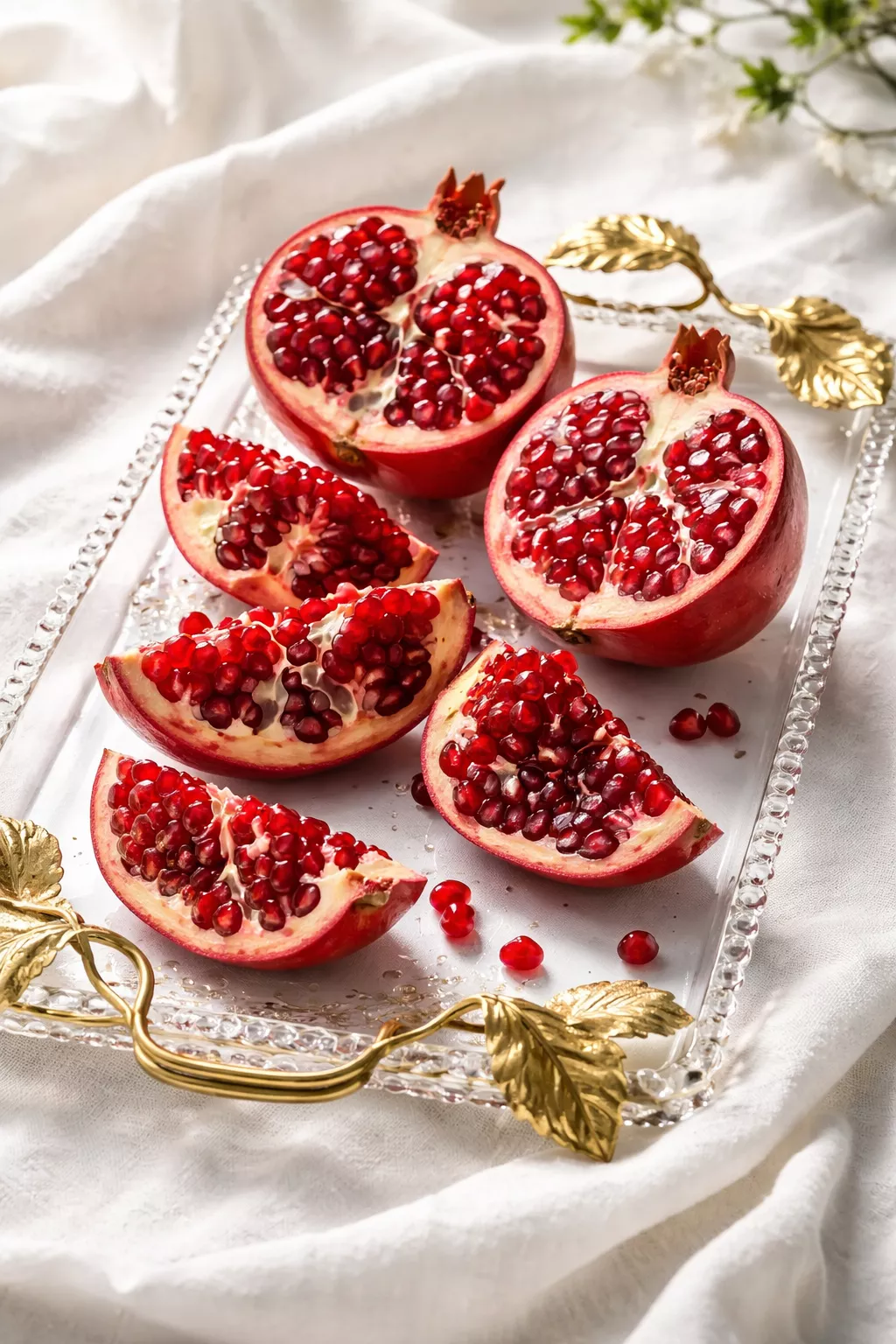 Slice the fruit in half to reveal those jewel like seeds and arrange them on wooden or glass trays.