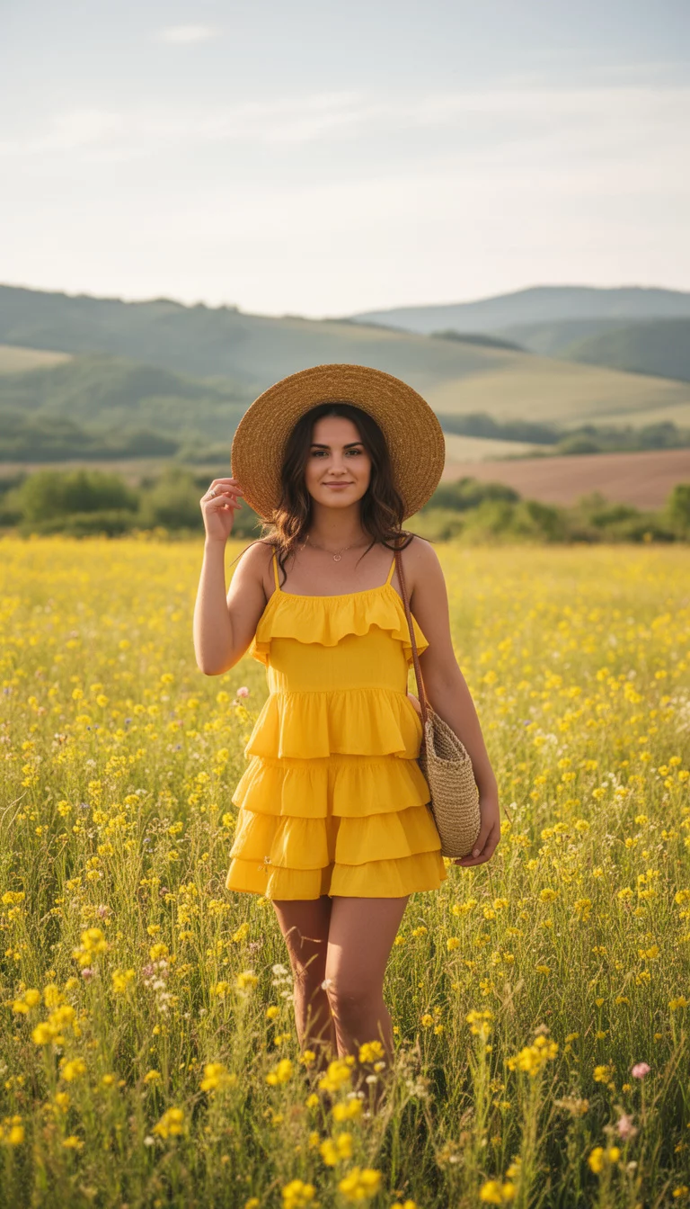 Bright Yellow Ruffled Mini Dress And Wide Brimmed Hat